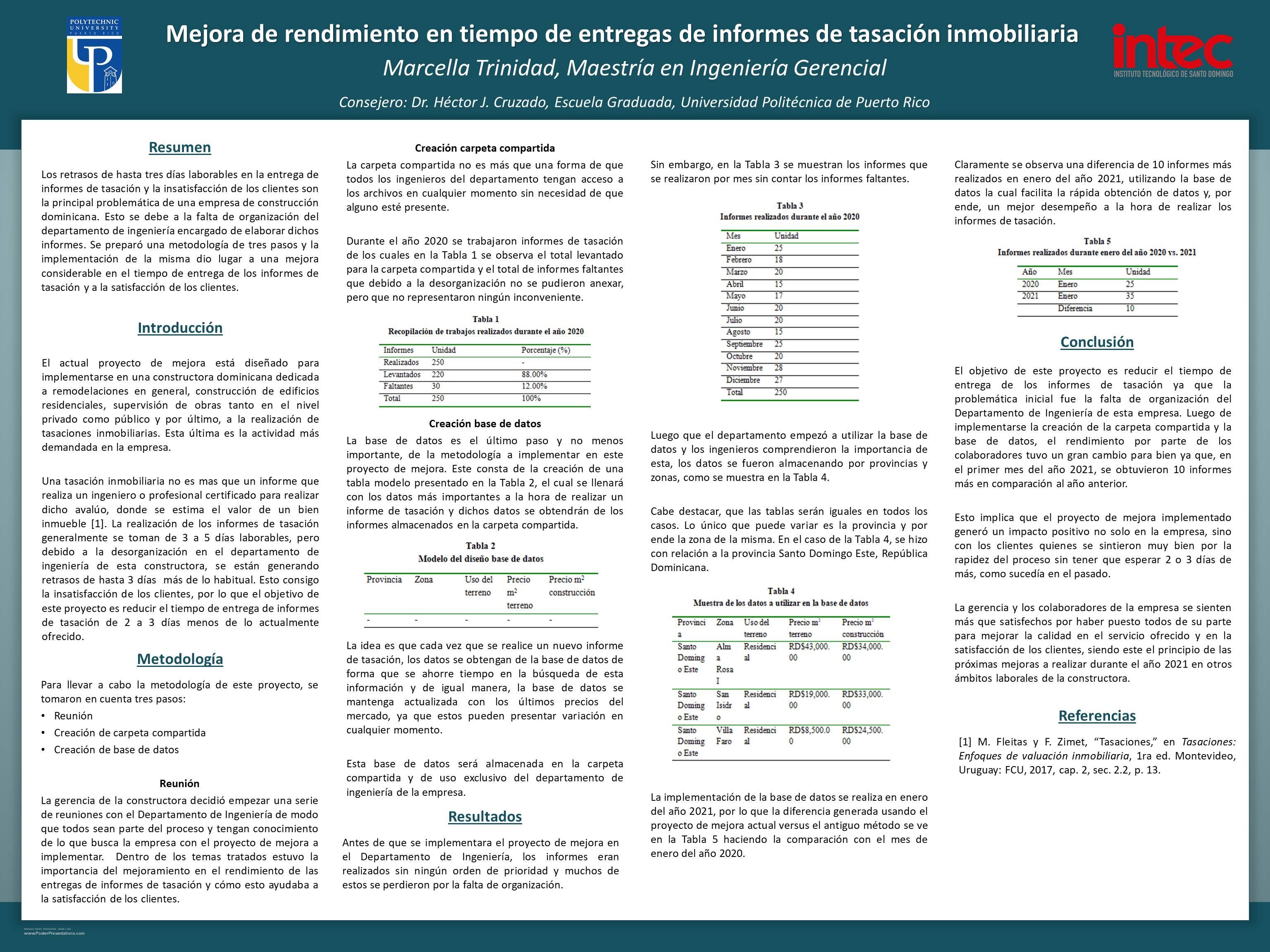 Trinidad, M. (2020). Mejora de rendimiento en tiempo de entregas de informes de tasación inmobiliaria [Unpublished manuscript]. Graduate School, Polytechnic University of Puerto Rico.