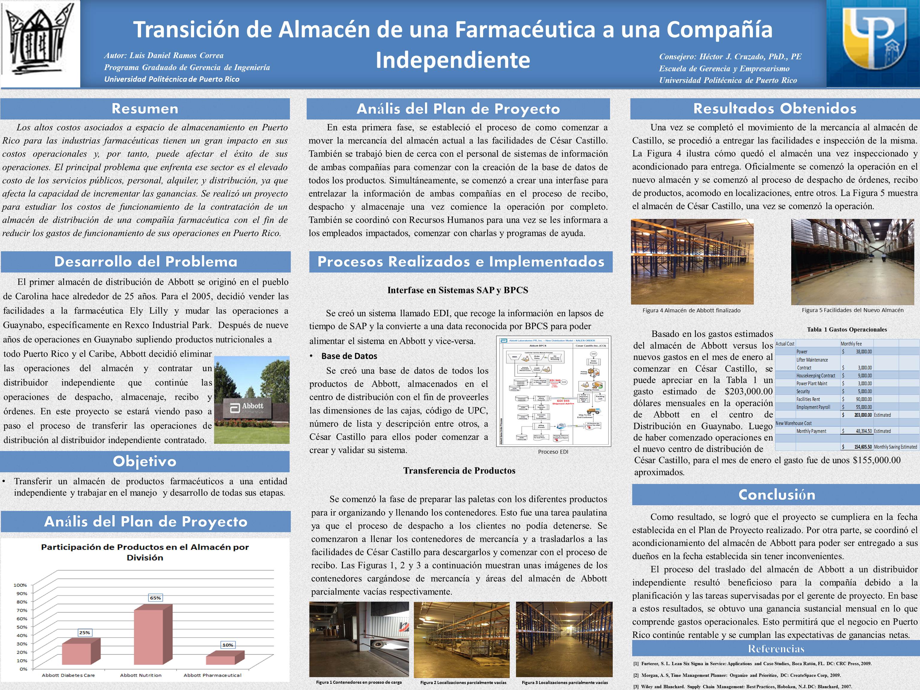 | dc.description.abstract | Los altos costos asociados a espacio de almacenamiento en Puerto Rico para las industrias farmacéuticas tienen un gran impacto en sus costos operacionales y, por tanto, puede afectar el éxito de sus operaciones. El principal problema que enfrenta ese sector es el elevado costo de los servicios públicos, personal, alquiler, y distribución, ya que afecta la capacidad de incrementar las ganancias. Se realizó un proyecto para estudiar los costos de funcionamiento de la contratación de un almacén de distribución de una compañía farmacéutica con el fin de reducir los gastos de funcionamiento de sus operaciones en Puerto Rico. Key Terms ̶ Abbott, Base de Datos, Gerente de Proyecto, Interfase de Sistema. | en_US |