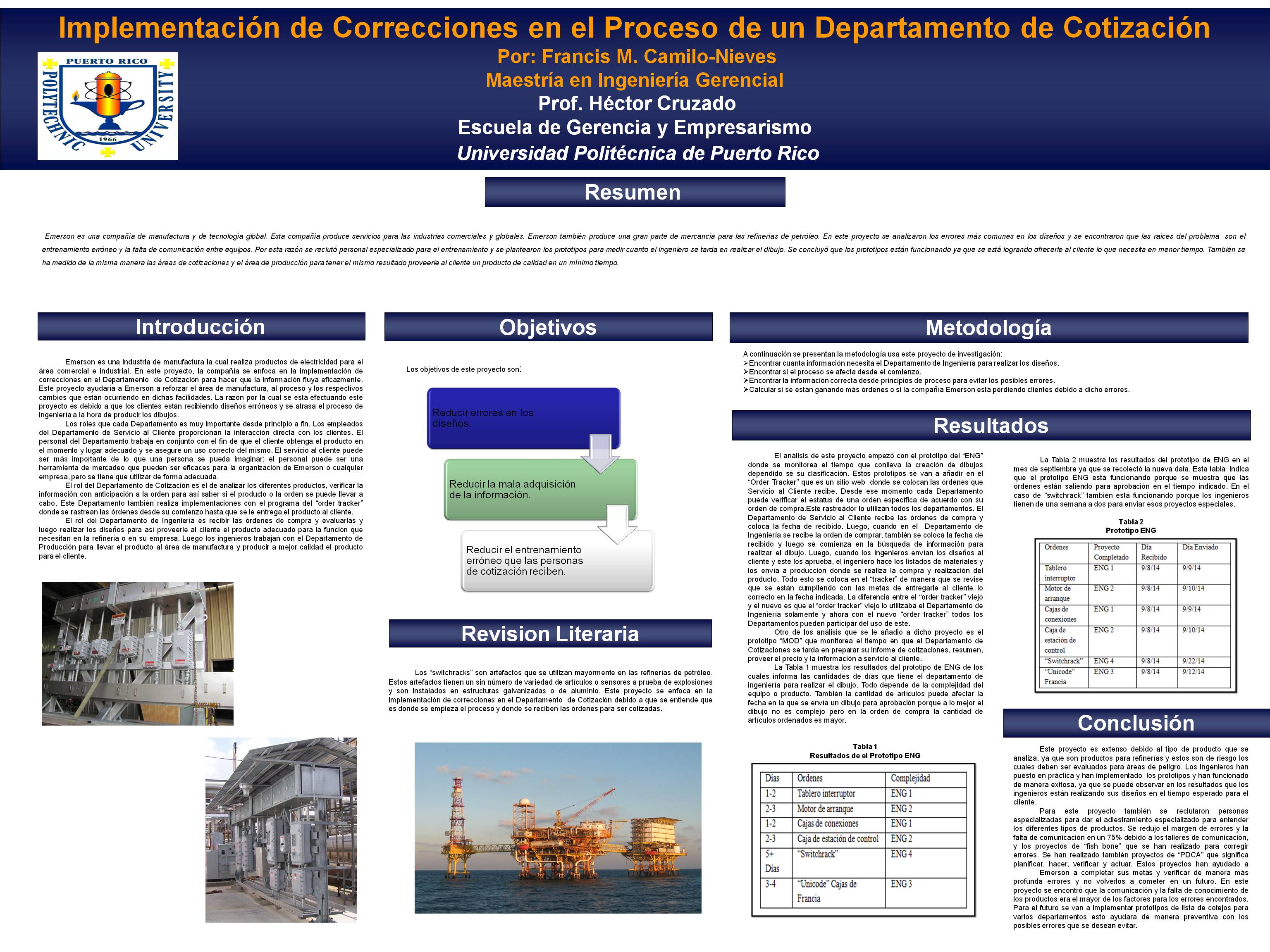 Camilo Nieves, F. M. (2014). Implementación de Correcciones en el Proceso del un Departamento de Cotización [Unpublished manuscript]. Graduate School, Polytechnic University of Puerto Rico.