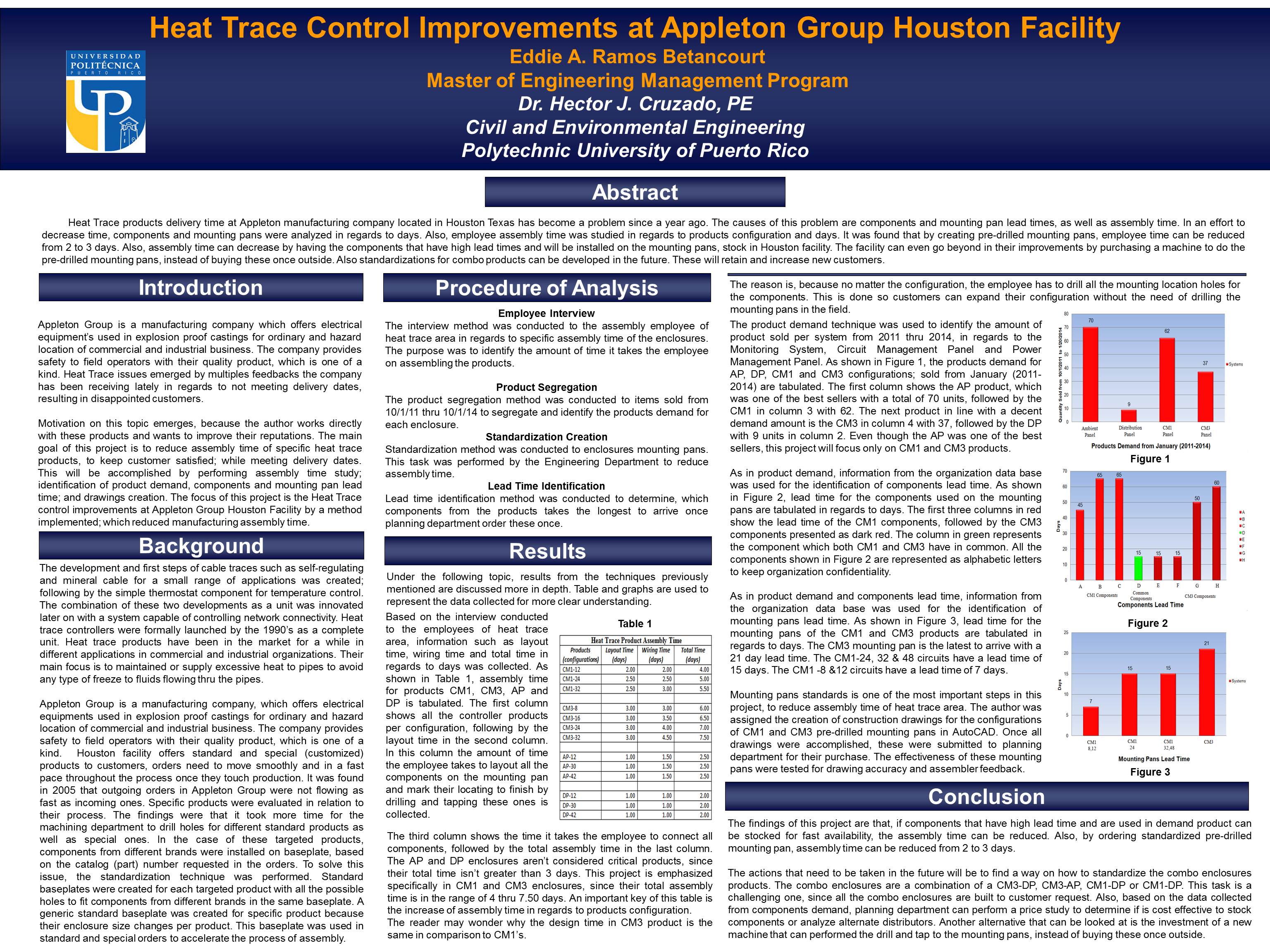 Heat Trace products delivery time at Appleton manufacturing company located in Houston Texas has become a problem since a year ago. The causes of this problem are components and mounting pan lead times, as well as assembly time. In an effort to decrease time, components and mounting pans were analyzed in regards to days. Also, employee assembly time was studied in regards to products configuration and days. It was found that by creating pre-drilled mounting pans, employee time can be reduced from 2 to 3 days. Also, assembly time can decrease by having the components that have high lead times and will be installed on the mounting pans, stock in Houston facility. The facility can even go beyond in their improvements by purchasing a machine to do the pre-drilled mounting pans, instead of buying these once outside. Also standardizations for combo products can be developed in the future. These will retain and increase new customers. Key Terms ⎯ Assembly Innovation, Base plate Evolution, Components Standardization, Manufacturing Improvements.