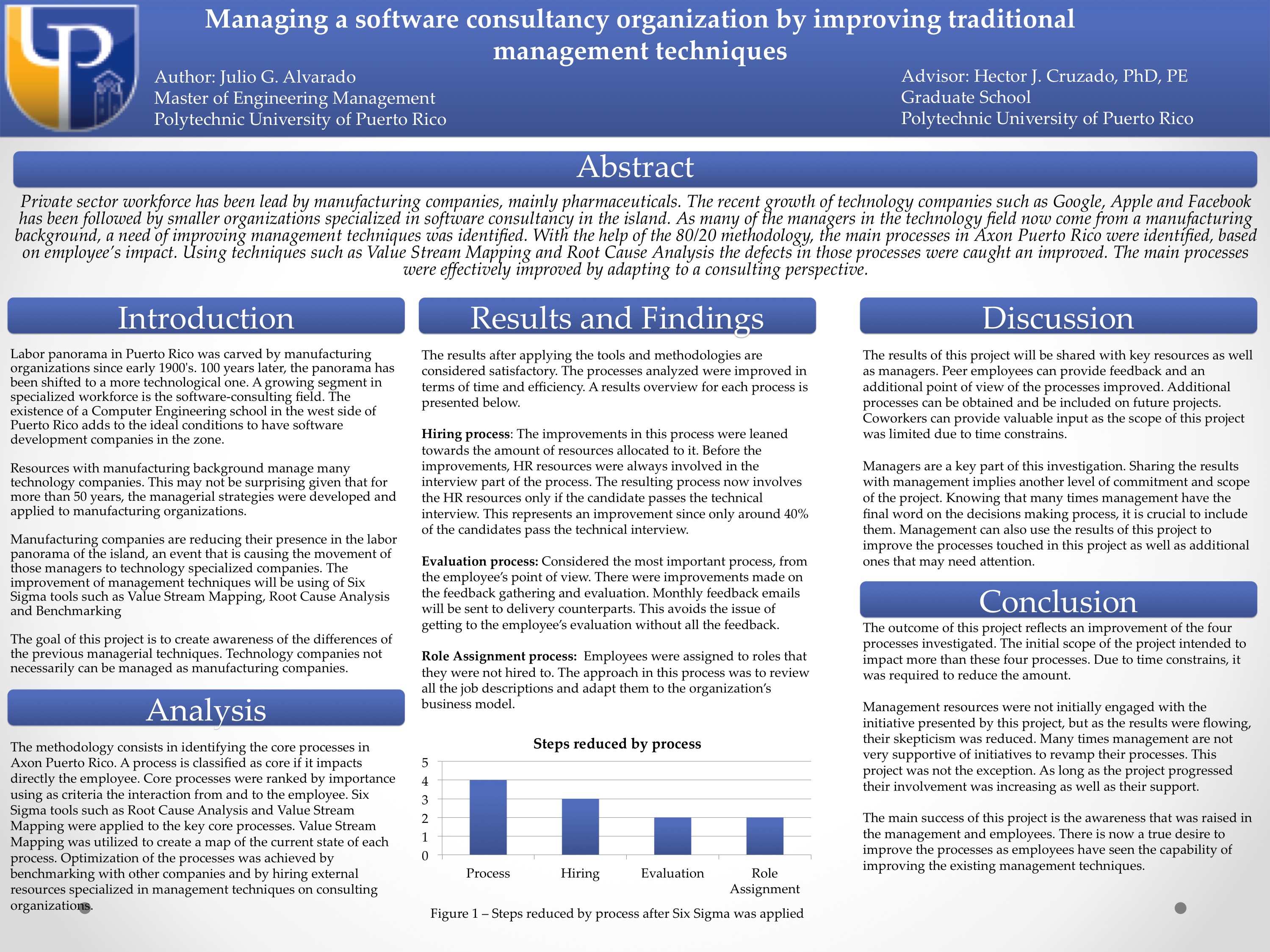 companies such as Google, Apple and Facebook has been followed by smaller organizations specialized in software consultancy in the island. As many of the managers in the technology field now come from a manufacturing background, a need of improving management techniques was identified. With the help of the 80/20 methodology, the main processes in Axon Puerto Rico were