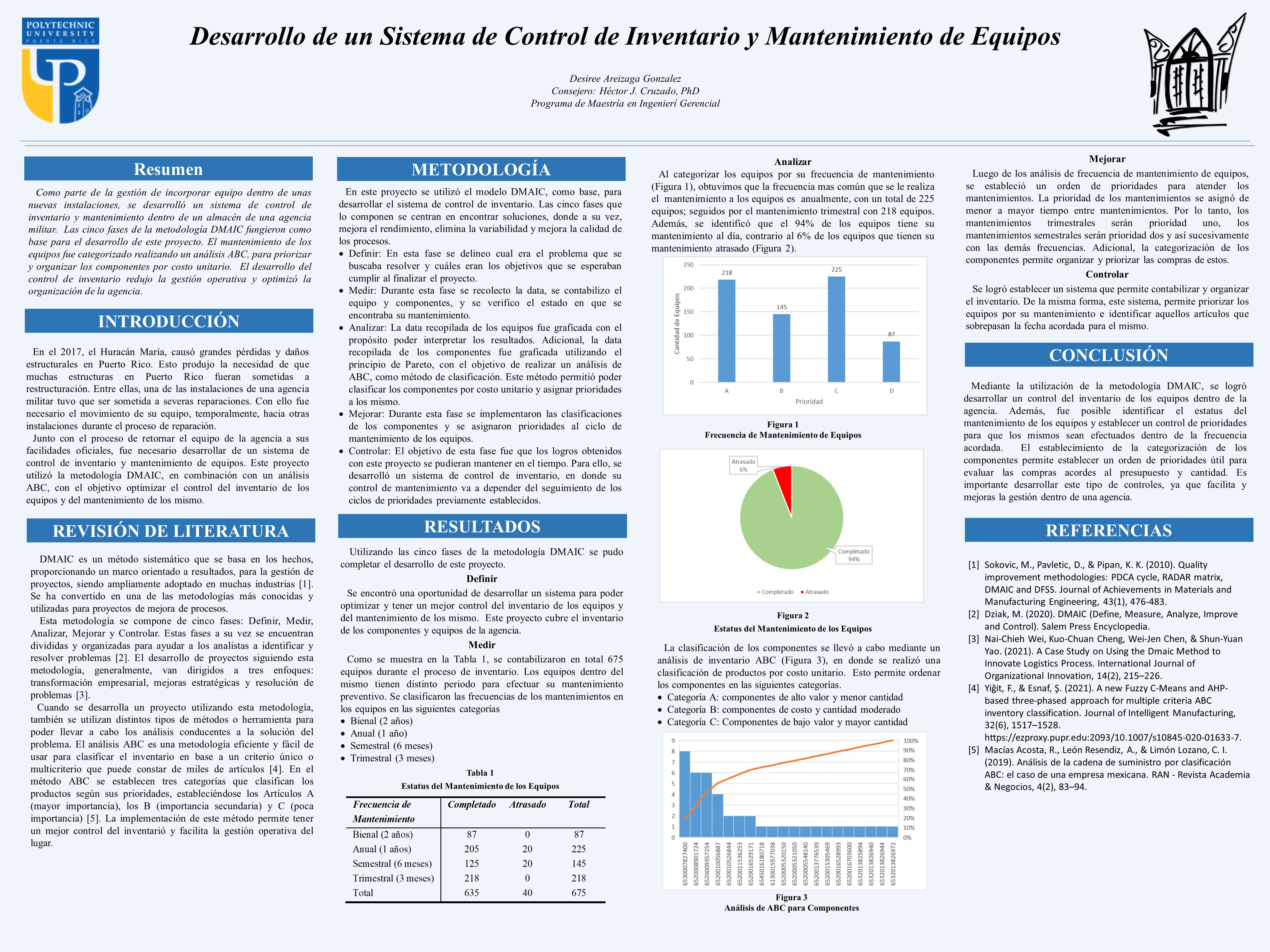 de inventario y mantenimiento dentro de un almacén de una agencia militar. Las cinco fases de la metodología DMAIC fungieron como base para el desarrollo de este proyecto. El mantenimiento de los equipos fue categorizado realizando un análisis