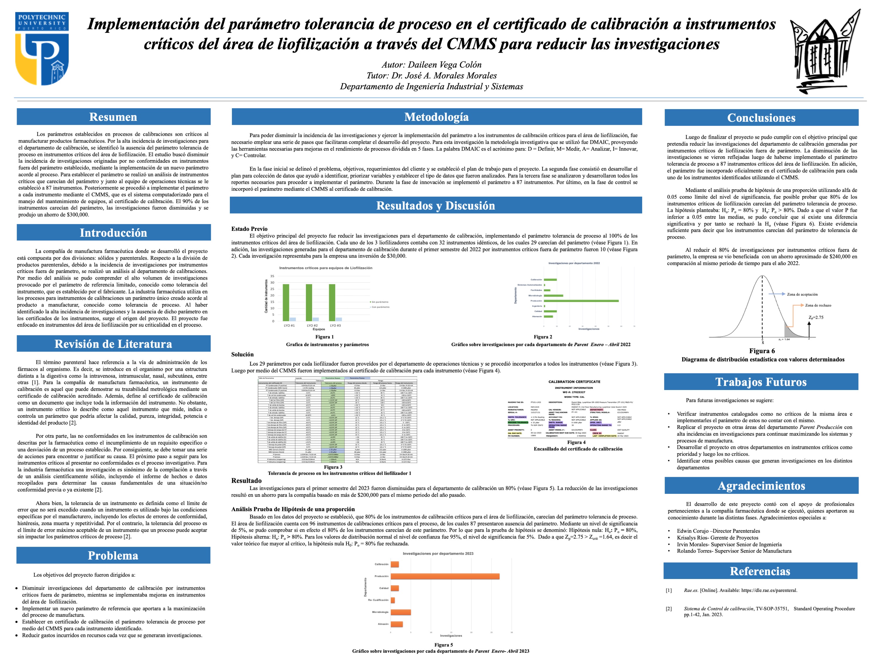 Vega Colón, D. (2023). Implementación del Parámetro Tolerancia de Proceso en el Certificado de Calibración a Instrumentos Críticos del Área de Liofilización a Través del CMMS para Reducir las Investigaciones [Unpublished manuscript]. Graduate School, Polytechnic University of Puerto Rico.